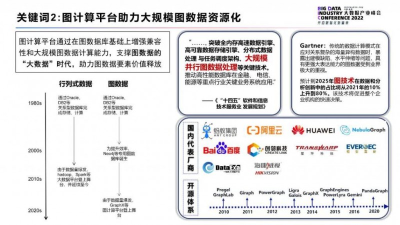 Gartner 预计,到 2025 年图技术在数据和分析创新中的占比将从 2021 年的 10% 上升到 80%。随着图数据规模的变大,开启了图数据的 " 大数据 " 时代,起源于 80 年代的传统关系型数据库,以及起源于 2000 年左右的专用图数据库已经无法支撑大规模图数据的高效存储与计算。
